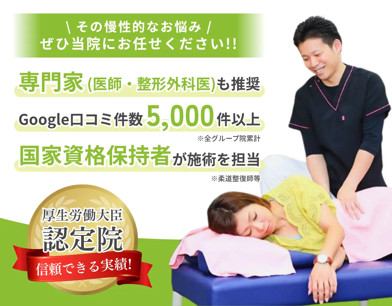 初めてだとどうしても不安もあると思います。 当院では、少しでも不安を解消していただけるように事前にわかりやすく説明させていただきます。 施術内容も、危険な内容は一切なく、リラックスしながら受けられますのでご安心ください。